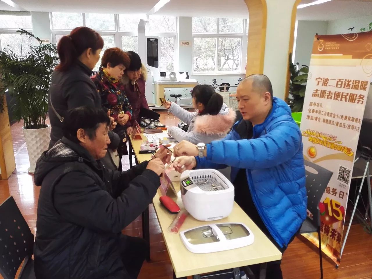 12月28日,一個陰雨綿綿的日子,冷空氣的到來,使甬城染上了絲絲涼意。這樣的日子里,寧波二百志愿者團隊一大早便驅(qū)車趕往位于鐘公廟街道的鐘盈小區(qū)進行便民服務(wù)。盡管天氣欠佳,但志愿者的熱情確絲毫未曾懈怠,到了小區(qū)服務(wù)點之后??粗蝗喝呵皝淼睦夏昃用?,二百志愿者們開啟了忙碌的“行程”。此次二百提供的便民項目主要有:黃金眼鏡清洗、皮帶打孔、血壓測量、義務(wù)理發(fā)以及貴賓卡免費申領(lǐng)。